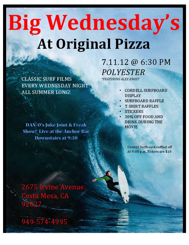 "Big Wednesday's" start tonight @ 6:30 with "Polyester" featuring Newport's very own Alex Knost. 20% off your total bill during the film. $10 raffle for a 5-10 Cordell Surfboard. After the movie head on downstairs and check Dano Forte Juke Joint Freak Show. Don't forget It's Ladies Night at The Anchor w/ Bree Phillips. Girls drink for 1/2 price
