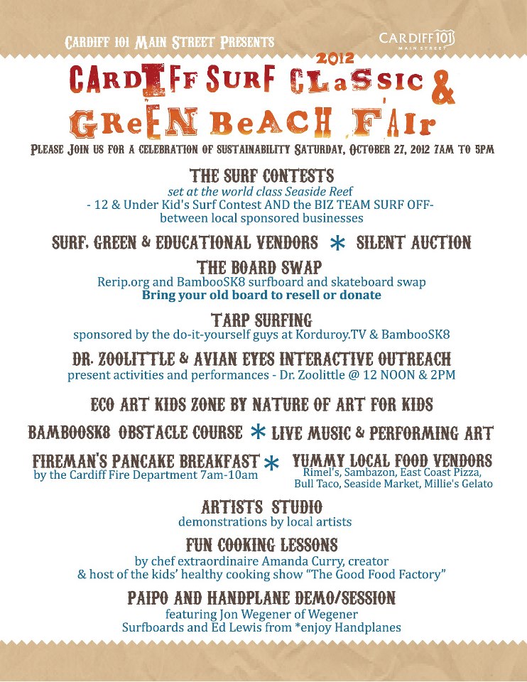 The Cardiff Surf Classic and Green Beach Fair is a fun, grassroots community event that pays homage to our Earth. The annual event, slated for Sat., Oct. 27 2012 from 7 a.m.-5 p.m., will include a kids' surf contest, business surf off, eco-friendly vendors, delicious food, tarp surfing, local artists, Dr. Zoolittle, live music, a paipo and handplane demo and more! http://cardiffsurfclassic.com/