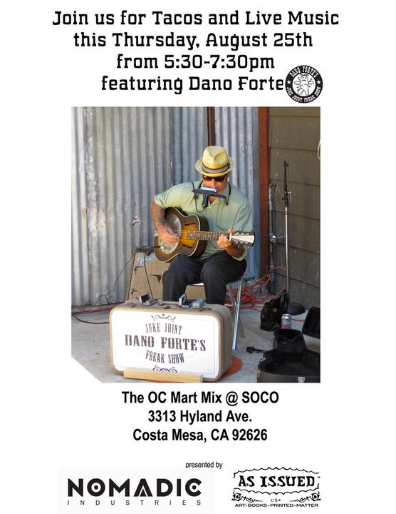 Our man Dano is taking the stage this Thursday from 5:30-7:30pm. Hear one man fill an entire industrial building with his croonin' rhythm n' blues, eat tacos and sip wine, beer, or sangria! Nomadic Gallery and newly added As Issued book selection will be open late for viewing.